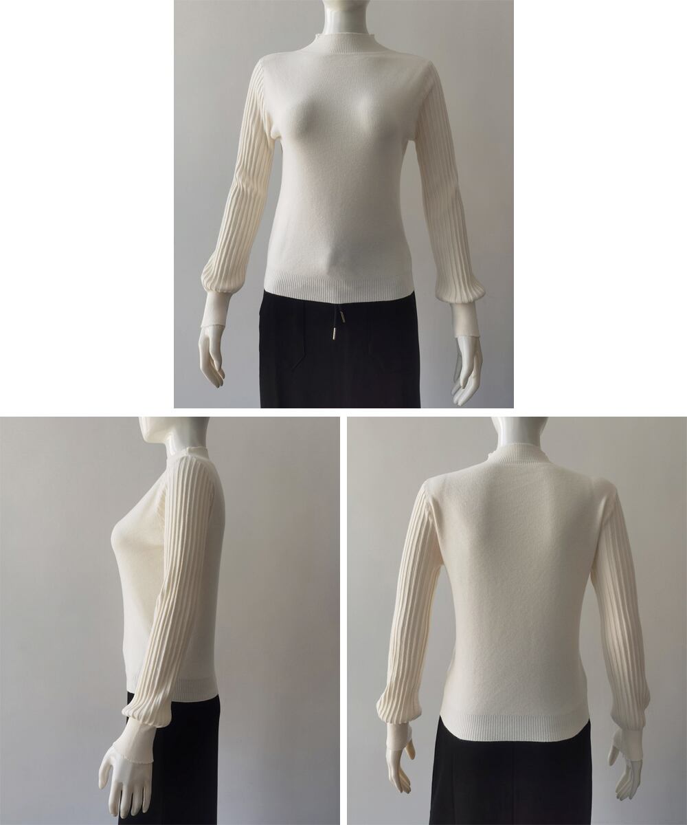 プチハイネック 長袖 ニットセーター プリーツ袖 オフィスカジュアル ニットウエア 無地 ニットインナー大人